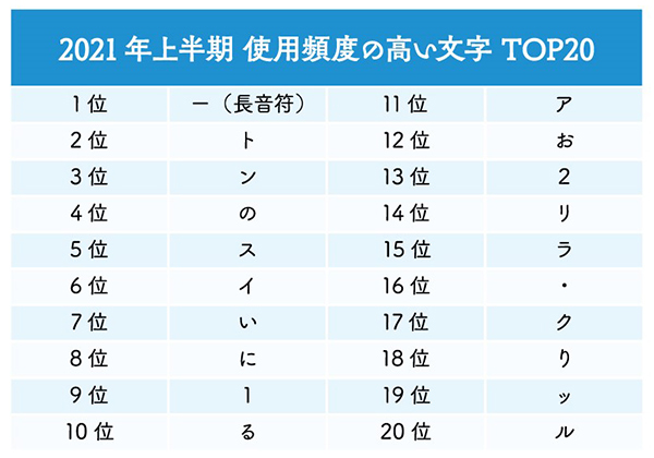 今回の特設Webサイト「FONTPLUS GALLERY」の公開に伴い、同社では2021年の上半期に使用頻度が高かった文字のランキングも発表。「FONTPLUS」の利用サイト全てを対象に集計が行われ、2021年1月1日(金・祝)〜6月30日(水)に使用頻度が高かった文字のトップ20が公開されている。