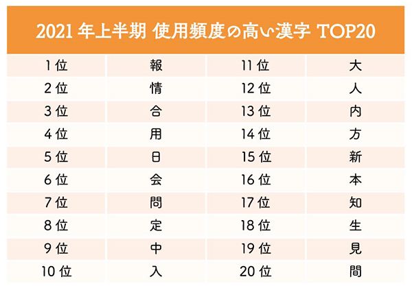 そのデータによると、漢字を除く日本語(ひらがな/カタカナ)、欧文、数字、記号など全ての文字を対象にしたランキングの1位は音引・長音符の「ー」。漢字を対象としたランキングでは1位が「報」で、2位が「情」であることから、「情報」という単語が多く使われているとの分析が行われている。