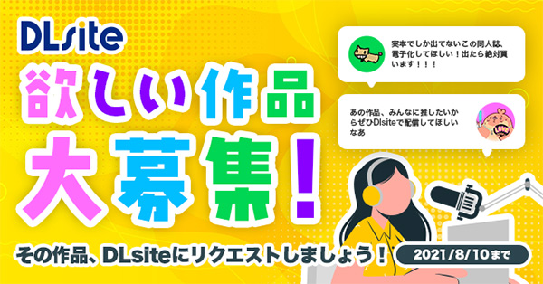なお、「DLsite」では、2021年8月10日(火)の13:59まで「DLsiteで購入したい作品」のリクエストを募集するキャンペーンも同時開催中(https://www.dlsite.com/modpub/campaign/home/want_works_campaign/)。個人による作品か商業作品か、作品形式や年齢区分などを問わずに幅広くリクエストを受け付けており、寄せられたリクエストは「DLsite」の運営スタッフにより、取り扱いの実現に向けて検討・挑戦していく。