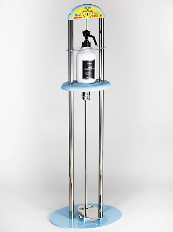「こども専用の消毒スタンド」のサイズは幅30cm×奥行25cm×高さ86cm、重量は4.0kg。500mlから1Lまでのポンプを使用できる。材料にはスチール、ステンレス(光沢部)などとなっている。