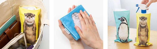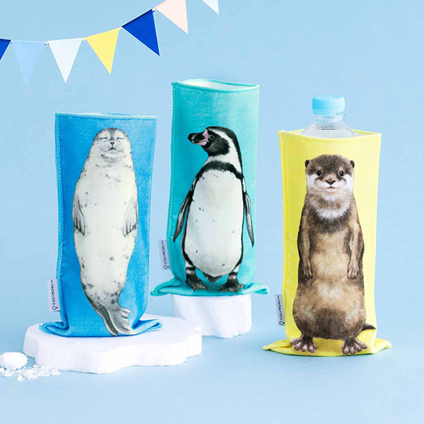 「机の上に立つ 水族館ペットボトルタオル」は、500mlサイズのペットボトルが入る大きさ。表面についた水滴を吸い取ってくれるので、冷たいドリンクをバッグの中に入れて持ち歩く際に使いやすい。二つ折にしてハンドタオルとして使用可能で、部屋に置いた消臭スプレーボトルの目隠しなどに使うこともできる。