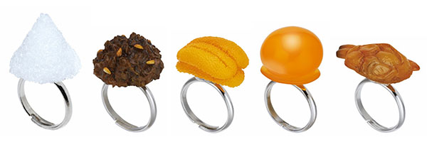 「おにぎりん具4」は、おにぎりと具材をモチーフにした指輪。三角のおにぎり型ケースを開くと、指輪が収納されている。おかかや卵黄の醤油漬けなど、多様なおにぎりの具材をリアルに再現している。あさりのしぐれ煮用のおにぎり型ケースのみ、ケースの色味が醤油がかっている。