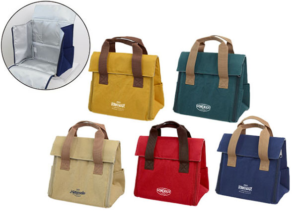 「ミコノスデュオ 抗菌ワイドオープンランチバッグ」のサイズは幅23×奥14×高19cm。生地は表側がキャンバス生地、裏地には抗菌剤SILADURを塗布したシルバーコーティング生地を使用。表も裏も抗菌加工が施されている。