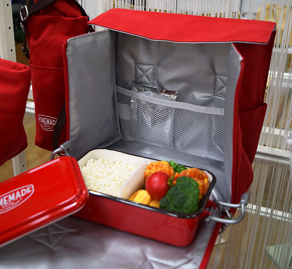「ミコノスデュオ 抗菌ワイドオープンランチバッグ」は、両ファスナーが大きく開き弁当箱が出し入れしやすい設計。2か所のファスナーを大きく開いた状態で、仕切りを備えたランチマットとして使うこともできる。両サイドと内側にポケットが付いており、保冷剤などを収納しておける。