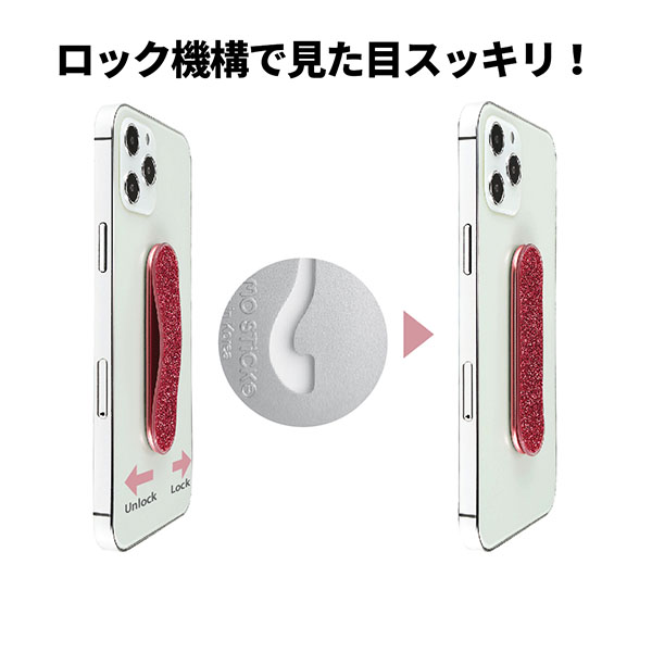 「MOMOSTICK Lock プラス」は、スライドロック搭載でスッキリと取り付けられるスマホ用バンド。スライドロックを解除するとバンドが浮き上がり、指で握ることができる。3段階でサイズ調整ができるので、指の大きさに合わせてバンドの幅を固定可能。縦向きと横向きどちらの向きでもスタンドとして使用できる。