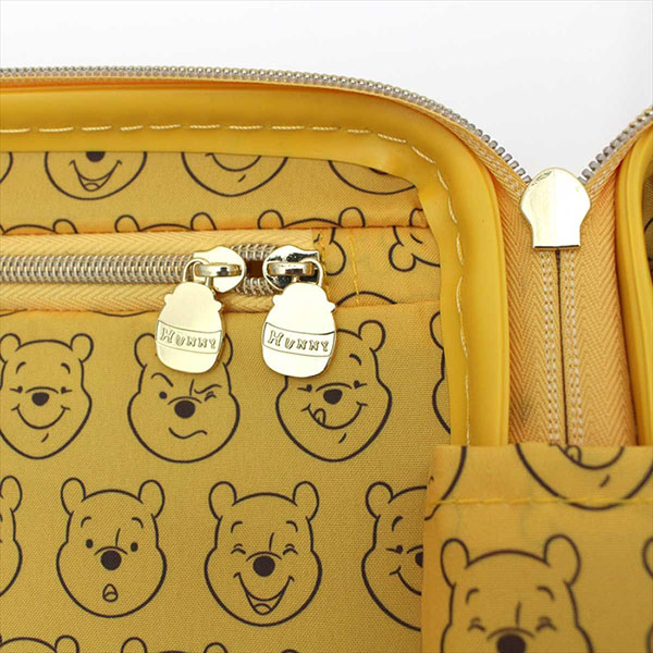 本製品は、「くまのプーさん」をモチーフにしたアイテム。全体のカラーに黄色を採用したよく目立つデザインで、側面にはくまのプーさんの顔をあしらっている。中生地にくまのプーさんの顔が並ぶ柄を採用しているだけでなく、チャックやキャスターには蜂蜜の瓶をデザインするなど細部にこだわった仕上がりだ。