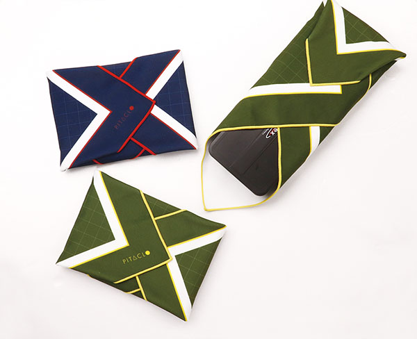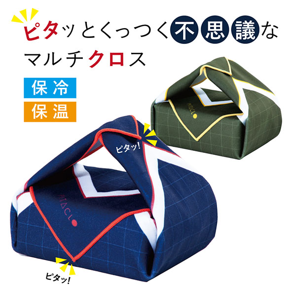 「ピタクロ」は、繊維が密着してくっつく特殊素材のお弁当クロス。面ファスナーテープが付いていないが、締め付けの強弱が自由自在にでき、ゴム留めが必要ない。正方形、長方形、三角形など、用途に合わせて使いわけられる。アルミコートを使用しているので、10時間後も氷が残る保冷機能、冷めにくい保温機能を備えている。