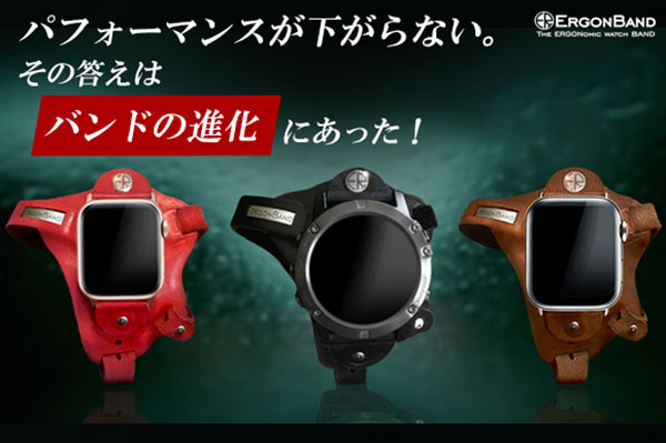 「ErgonBand」は、人間工学に基づいた見やすい位置でスマートウォッチを固定できる製品。手首ではなく手の甲の内側に寄った位置にスマートウォッチを固定するので、手首をひねることなく画面を確認できる。高品質の本革を使用し、100以上の精巧な工程を手作業で施した丁寧な仕上がり。