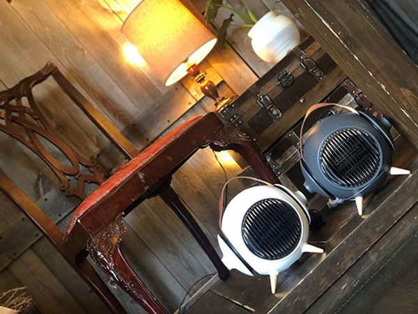 「MARUKO」は、球体デザインのPTCセラミックヒーター。最大1000Wの強熱風で、電源を入れて3秒で空間を暖める。3段階でモードを切り替えられ、COOL(送風)、HOT(弱熱風)、HIGH HOT(強熱風)を使い分け可能。運転状態で本体右側のつまみを押すと左右首振りモードになり、本体左側のつまみを回すとルーバーファンが上下に動くのでアングル調整ができる。