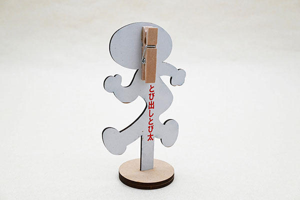本製品は、昔ながらの懐かしさが漂うキャラクター「とびだしとび太」のグッズ。「とびだしとび太」の製作で知られる看板制作会社「久田工芸」の企画協力により実現した製品となっている。素材がMDF材で看板らしい木材の雰囲気が漂っている。
