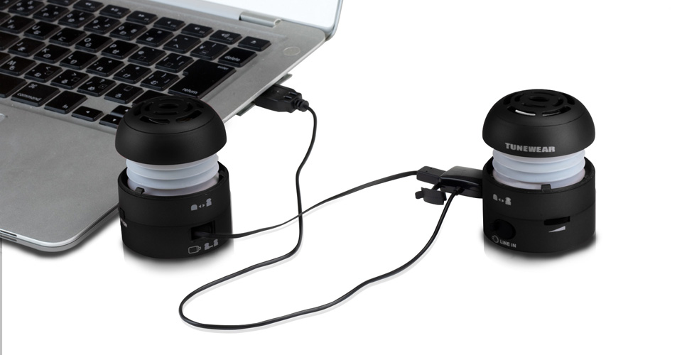 また、コンパクトでありながら、ダイナミックなステレオサウンドの再生が可能。さらに、本体にボリュームスイッチを搭載し、スピーカー側でのボリューム調整が行える。この他、左右のスピーカーを接続するケーブルを本体内部に巻き取り式で収納可能。