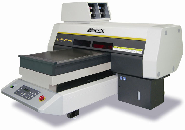 (株)ミマキエンジニアリングは、LED方式のインクジェットプリンタ「UJF-3042」を発売開始。PETなど熱で変形しやすい素材へのプリントが行える。UV硬化プリントを採用し、樹脂や木材、金属などへのプリントも可能。