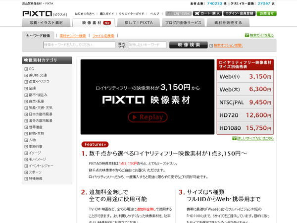 フルハイビジョン対応の映像素材販売サービス投稿型の写真・イラスト素材の販売サイト『PIXTA』(ピクスタ、運営:ピクスタ株式会社)が、テレビ番組や商業映像に利用できる映像素材の販売サービスを開始した。開始当初は約4000点の映像素材を販売しており、WEB用からフルハイビジョンまでのサイズに対応している。1点3150円から利用可能(価格はサイズごとに異なる)。