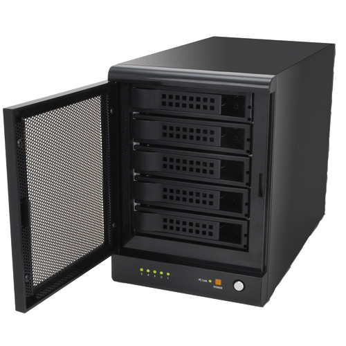 また、5台のHDDの個別認識や、まとめて1つとして認識できる設定などが可能。さらに、HDDの取り付けや交換が手軽に行えるカートリッジ方式を採用している。この他、250Wの電源を搭載し、大容量のHDDを搭載しても安定した動作を実現。