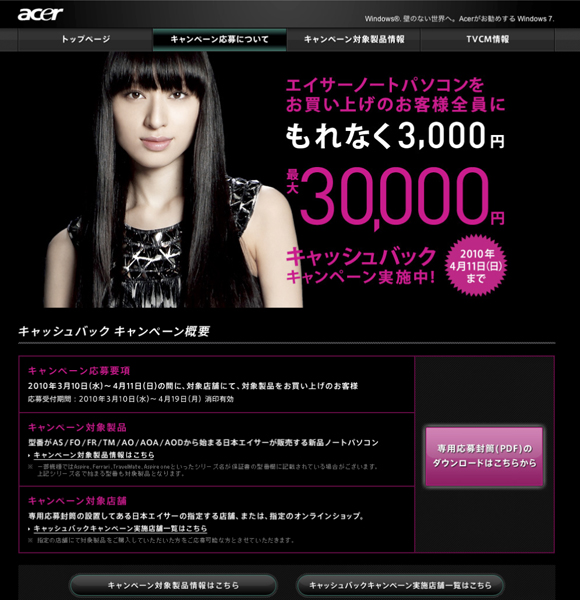 日本エイサー(株)は、同社のノートPCを購入すると3000円がキャッシュバックされるキャンペーンを実施中。2010年3月10日から4月11日までの間に対象製品を購入した人が対象となる。