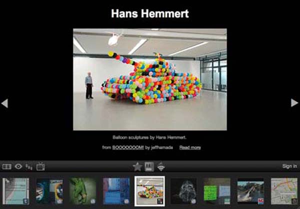 また、大きな画面のメインコンテンツと、その下にいくつかのサムネイル画像が提示され、右矢印キーを押していくことで次々とコンテンツを表示できる。この他、Googleアカウントへのログインは、気に入ったコンテンツを友人と共有したり、お気に入りに登録したりする際に初めて必要となる。