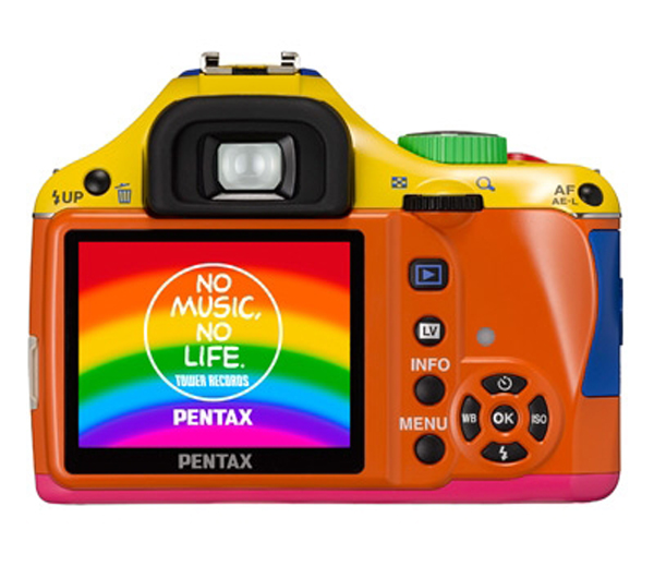 PENTAX K-xシリーズは、ボディーカラーを100パターンから選べることで話題。コラボモデルのデザインには、今年度のタワーレコードのテーマである"虹"を採用している。また、起動時の液晶モニターもタワーレコード別注仕様となっている。
