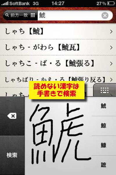 総項目数は約23万9000項目(漢字項目3557を含む)。また、手書き入力で漢字を検索でき、読めない漢字でも検索可能。さらに、検索方式には「前方一致あいまい検索」、「前方一致厳密検索」、「部分一致検索」の3種類を用意。この他、解説文中の文字列を検索することもできる。