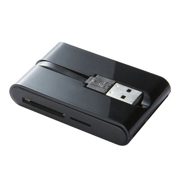SDカード同士、microSD同士、SDカードとmicroSDなどメディア間の相互認識、コピーが行える。また、SDHC 32GBやmicroSDHC 16GBなど大容量メモリーカードにも対応。ケーブル一体型コネクタは本体裏側に収納できるためモバイルにも最適だ。