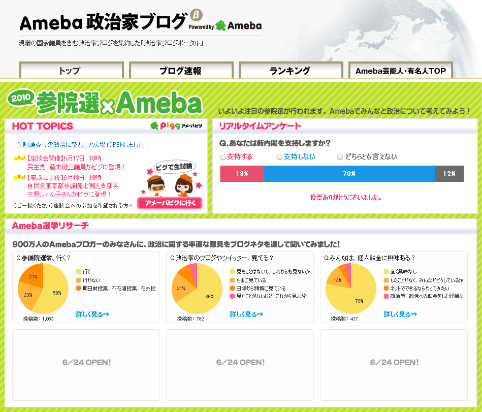 同サイトは、900万人を超えるAmeba会員に向けて「投票に行くか」、「新内閣に望むこと」、「政治家のブログやTwitterに望むこと」といった設問を用意し、寄せられたアンケートやブログ記事をリアルタイムで表示する。さらに政治家ブログへのリンクやアメーバなうへのリンクも掲載される。