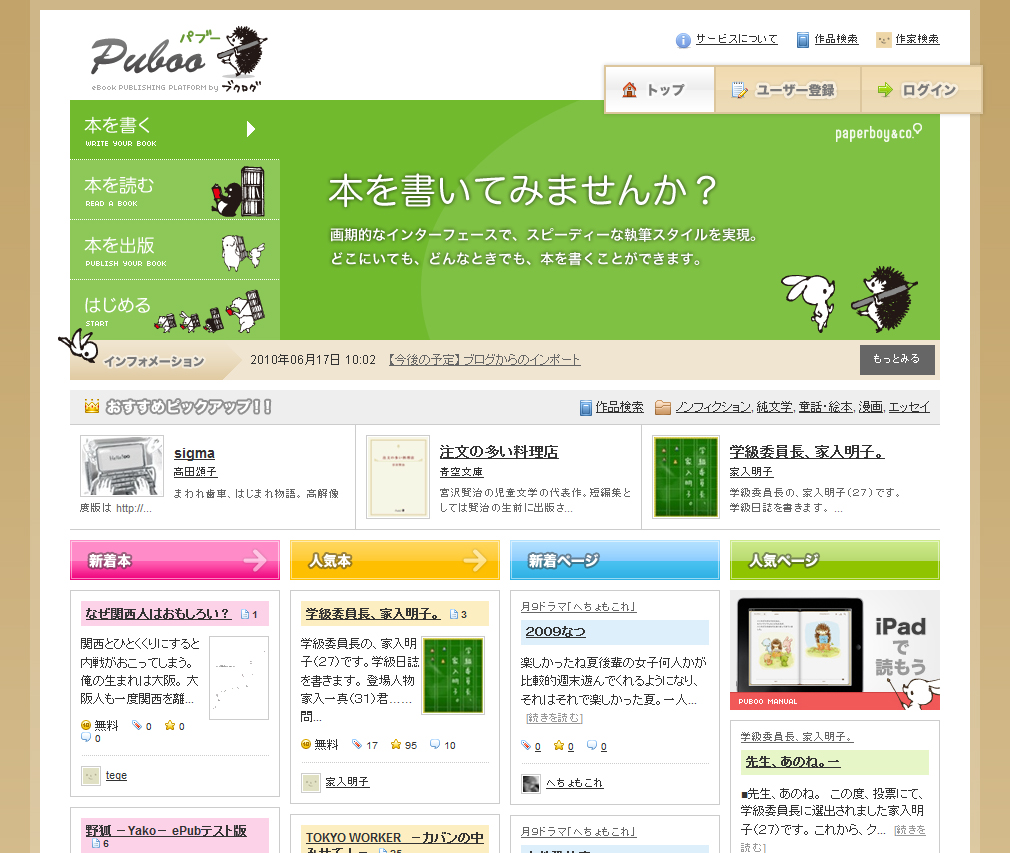 (株)paperboy&co.は、同社が運営するブックレビューコミュニティサイト「ブクログ」内にて個人で電子書籍の作成などが行えるサービス「パブー」の提供を開始した。利用料金は無料となっている。