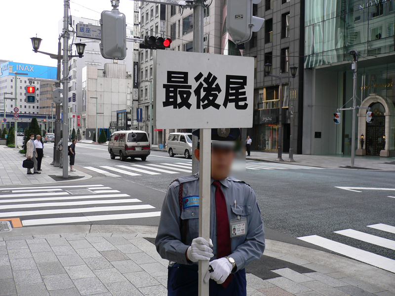 最後尾でプラカードをもつ警備員。行列は銀座一丁目交差点まで伸びていた