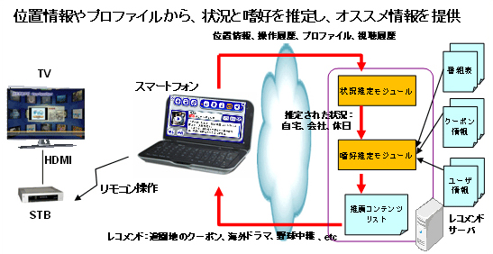 同システムは、Android搭載タッチパネル式のスマートフォンから番組やコンテンツの選択、テレビ機器のリモコン操作、外出先での情報収集が行えるというもの。時間や位置を考慮した状況推定技術と、推定された状況や視聴履歴に基づく嗜好推定技術が用いられており、利用シーンに最適な情報が提供される仕組みだ。