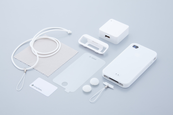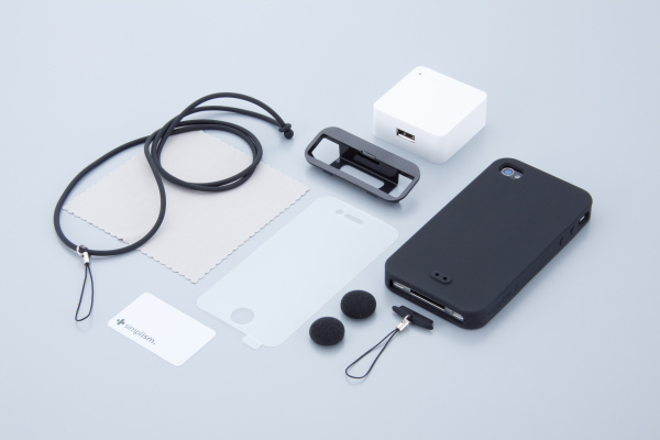 セット内容はアンチダストコートが施されたシリコンケースと、ネックストラップ、USB充電器、イヤフォンに装着するイヤーパッド、ディスプレイ保護フィルム、マイクロファイバークリーニングクロス、フィルム貼付補助カード、Dockコネクタカバー、付属のシリコンケースを装着したままUniversal Dockなどを利用するためのユニバーサルDockアダプタの9点。