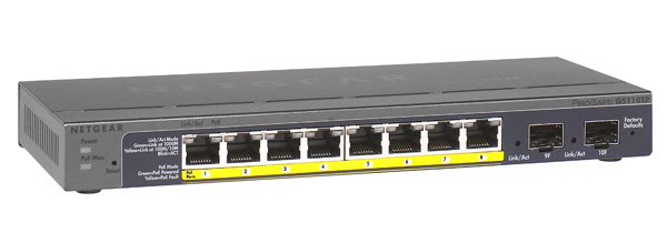 ネットギアジャパン(株)は、PoE給電対応ギガビットポート8つとSFPスロットをふたつ備えたギガビットスマートスイッチ「GS110TP」を発売すると発表した。価格は4万9350円となっている。
