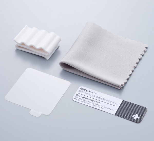 同製品はフィルムとディスプレイ間のシリコン吸着面に特殊加工を施したことで、気泡を残さずに貼ることができるバブルレス仕様の液晶保護フィルムだ。光沢タイプ(クリスタルクリア)と反射防止タイプ(アンチグレア)の2種類が用意されている。貼る際に役立つクリーニングクロスと埃取りテープのほか、イヤホンケーブルをすっきりまとめられるケーブルクリップが付属している。