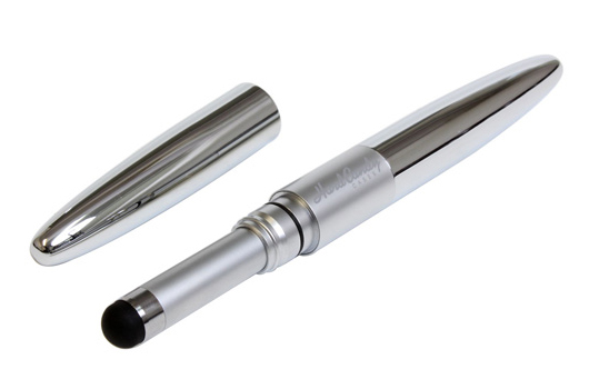 同製品は手書きアプリケーションと変わらない書き心地を実現した、光沢感のあるクロムデザインが特徴的なiPad/iPhone/iPod touch用スタイラスペンだ。反対側のカバーを外すとボールペンとしても利用できる。重さは80g。