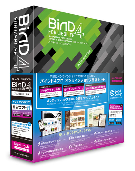 (株)デジタルステージは、Webオーサリングソフト「BiND for WebLiFE* 4」のプロフェッショナル版にECサイト専用のテンプレート集「オンラインショップ・コレクション」などをセットにしたオールインパッケージ「BiND 4プロ オンラインショップ開店セット」を12月17日に発売すると発表した。Windows版とMac版が用意されており、価格は3万4800円となっている。
