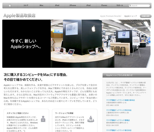 アップル、ヤマダ電機テックランド高槻大塚本店ほか6店のAppleショップがオープン