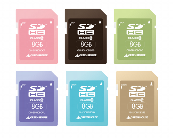 グリーンハウス、6色のカラーバリエーションを揃えた8GB SDHCカード