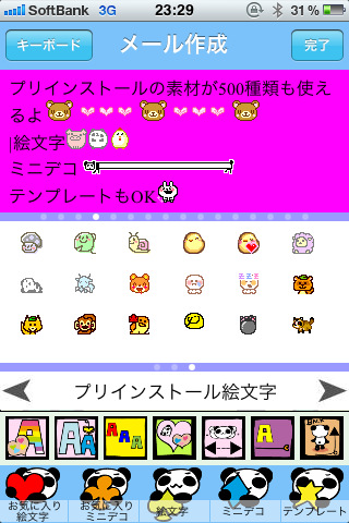 同アプリはプリインストールされたデコメ素材を利用でき、メール本文中に動く絵文字画像を挿入したり、文字色・背景色の変更などを施したメールを携帯電話やスマートフォンに送ることが可能。また、プリインストール素材のほかにも、好みの素材を追加で購入できるショップ機能も備えている。