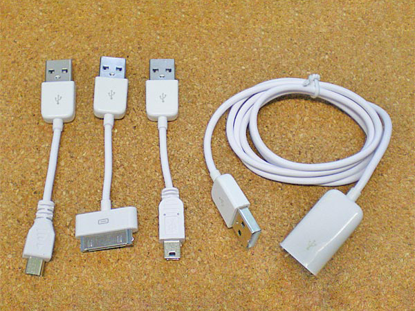 同製品はiPhoneや各種スマートフォンなど、USBポートを通じて充電を行う機器に対応したケーブルセットだ。ケーブルはiPhone/iPod用とminiUSB用、microUSB用の3種類に加えて長さ1mの延長ケーブルも用意されている。