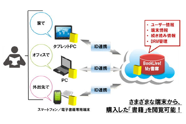 同サービスは電機メーカーなどとの協業により、PC・電子書籍専用端末・タブレット端末・スマートフォンなどあらゆる端末に対応する共通IDによるクラウド型電子書籍ストアを実現。コミック・小説・実用書などを中心に、サービス開始時には約3万点が用意される。今後は雑誌や写真集など取扱分野を拡充し、2011年春までにコンテンツ数を10万点まで増やす予定。さらに独自端末の開発も検討しているという。