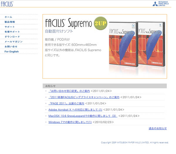 製本の面付け作業を効率化する「FACILIS Supremo」は、Intelプロセッサ搭載MacintoshやAcrobat 9に対応し、面付け済みデータのプリンタ直接送信機能や、折丁などのプリント機能などが強化されている。JDF出力オプションソフト「FACILIS JDFOption-B」もバージョンアップしWindows版もラインナップされている。
