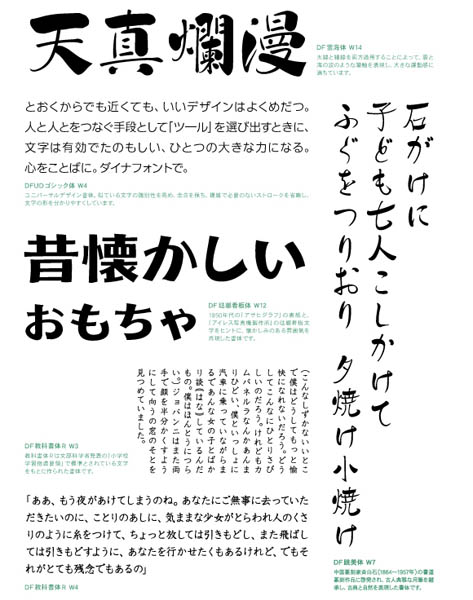 発表されたのは「DF雲海体W14」、「DF跳美体W7」、「DF琺瑯看板体W12」、 「DFUDゴシック体W4」、「DF教科書体RW3」、「DF教科書体RW4」の6書体、およびプロのクリエイター向けに開発した「OpenType Pro 1-6書体シリーズ」や、日本人名・中国人名の解決ソリューション「拡張人名外字書体シリーズ」などのリリースを予定している。