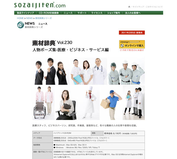 「素材辞典」のシリーズは、ロイヤリティフリーのデジタルフォトコレクションで、購入・登録したユーザーは何度でも使用でき、使用回数や用途による追加料金も発生しない。また使用に際しての許諾申請も不要で、同社や同製品のクレジット表記などの必要もないなどの理由と、豊富な写真コレクションで、1994年の発売以来シリーズを重ねている。次回の「素材辞典」は「Vol. 231 家族の団らん-暮らしと食事編」で2011年3月5日の予定だ。