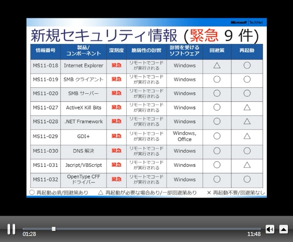 同社のWebサイトでは、これらの情報を「今月のマイクロソフト ワンポイント セキュリティ情報」と題して動画でも配信している。