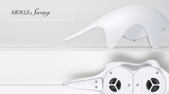 「ARIKUI Swing」は、数々のインダストリーデザインを手がけるカロインフォ株式会社(http://www.caroinfo.info/)がデザインしたパッシブ型ステレオスピーカー。普段は邪魔者扱いされるケーブルを「アリクイの口」に見立て、デザインの重要な要素として取り入れている。アンプレス設計のため、電源を気にせず気軽に音楽を楽しむことができる。ボディには高剛性のアルミニウムを採用し、不要な振動が発生しにくい構造となっている。スピーカーユニット直径は40mm、出力音圧レベルは81dB W/m、定格入力3W+3W、サイズは120x95x260mm、重さは960g。