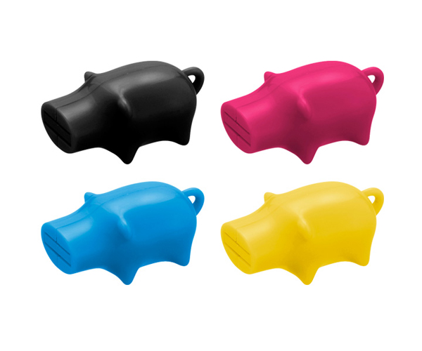 同商品は、ブタの鼻にあたる部分にスライド式のUSB端子を搭載し、しっぽにあたる部分にストラップホールを備えたUSBメモリ。容量4GB、色は、ブラック、ピンク、ブルー、イエローの4色。