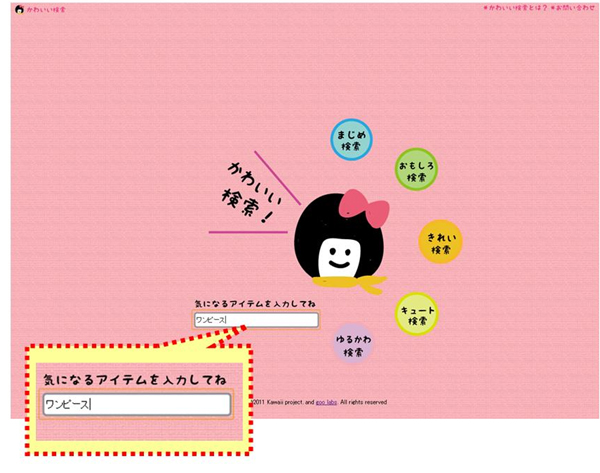 「かわいい検索」はブログ記事内で使われている絵文字や行間など、ブログの「見た目」から独自に設定した「ゆるかわ」や「きれい」などのタイプ別に分類し、検索結果として表示する。「gooラボ」のウェブサービス開発のノウハウを活用し、慶應大学の小川克彦研究室の女子学生3人でつくる「Kawaii Project」のアイデアを具現化した。