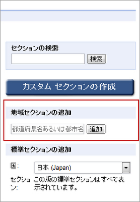 「地域セクション」は、GoogleニュースTOPページの右上のリンク「セクションを追加」をたどり、機能設定画面の地域名入力欄に任意の地域名を入力して設定する。こうすることで他のニュースカテゴリと同じく、設定地域に関連する最新のニュースが表示される。尚、「地域セクション」カテゴリは複数設定することが可能。