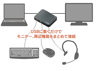 本製品は、メインディスプレイに加え、もう1台のサブディスプレイを追加し、1台のパソコンで2台のディスプレイの表示空間を同時に利用できる「マルチディスプレイ」環境を簡単に構築できるアダプターに、キーボードやマウスなどが接続できる2口のUSBポートと、音声入出力用のオーディオポートを装備したミニドッキングステーション。「マルチディスプレイ」環境だけでなく、追加したディスプレイと同じ画面を表示させる「ミラーリング」環境にすることもできる。
