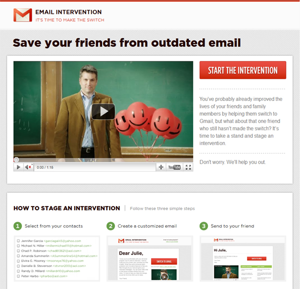「EMAIL INTERVENTION」サイトにアクセスし、「START THE INTERVENTION」ボタンをクリック後、Googleアカウントでログインすると、ユーザーの「連絡先」でGmail以外のアカウントを使っている人の一覧と、その人達が友人の何%にあたるかの比率のグラフが現れる。その画面で、Gmailの利用を勧めたいユーザーを選んで「Send」ボタンを押すと「Gmail」への乗り換えを促すメールが送られる。