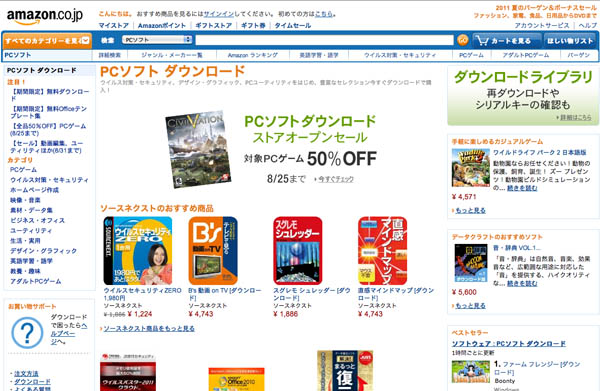 Amazon.co.jpは8月16日より、PCソフトをダウンロード購入できる「PCソフト ダウンロードストア」(http://www.amazon.co.jp/pcsoftdl)をオープンさせた。