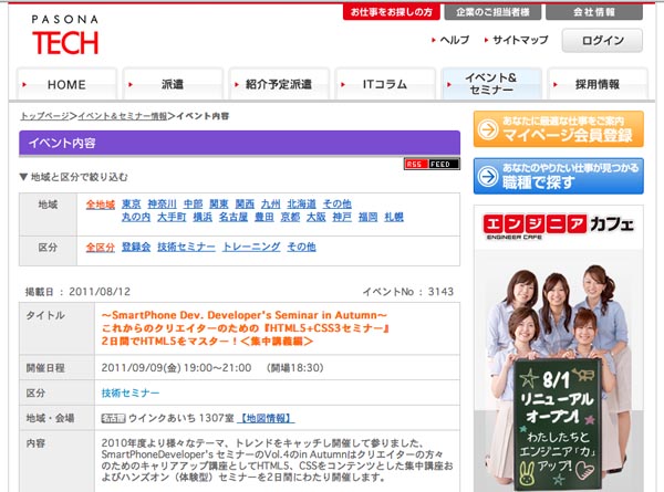 株式会社パソナテックは、スマートフォンに適したWEBデザイン、HTML5+CSS3を学ぶ「~SmartPhone Dev. Developer's Seminar in Autumn~これからのクリエイターのための『HTML5+CSS3セミナー』2日間でHTML5をマスター!<集中講義編>」を9月9日名古屋で開催する。