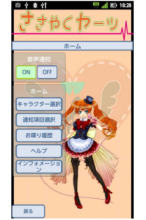 同時にリリースされたアプリ「ささやくヤーツ」は、独特の口癖を持ったキャラクターが、ショートメッセージが届いたときやフォローしているTwitterアカウントに新しいツイートがあったときに自動でその内容を読み上げたり、バッテリー残量や電波状況の変化などを通知したりするウィジェットアプリ。キャラクターは、東京コミュニケーションアート専門学校とのコラボレーションにより生まれた。